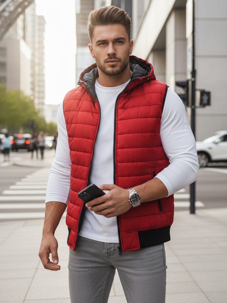 Prešiti podloženi telovnik s kapuco se zapenja s klasično zadrgo. Vest ima dva zunanja žepa z zadrgo. Kapuce ni mogoče sneti, lahko pa jo prilagodite z vrvico. Spodnji del in pazduhe so zaključene z elastičnim zaključkom.