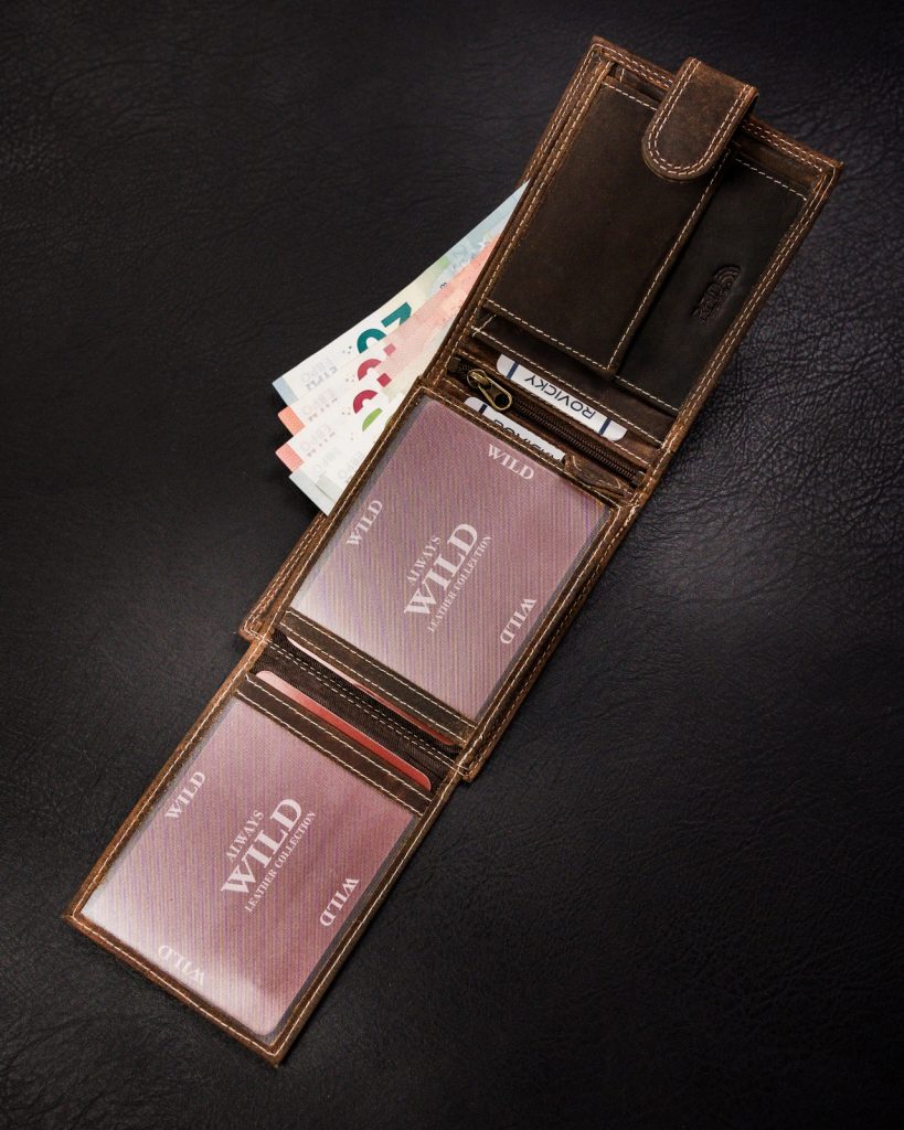 Denarnica elegantne oblike, izdelana iz kakovostnega usnja. Model denarnice je usmerjen po širini. Ta model ima praktično zaponko. Notranjost ima več predalčkov, kar bodo cenili vsi, ki radi hranijo kreditne kartice, kartice in druge stvari skupaj. Zaščita RFID je samoumevna.