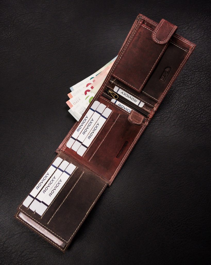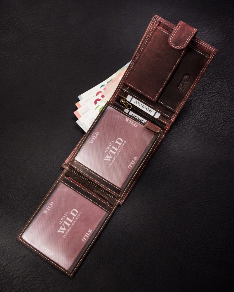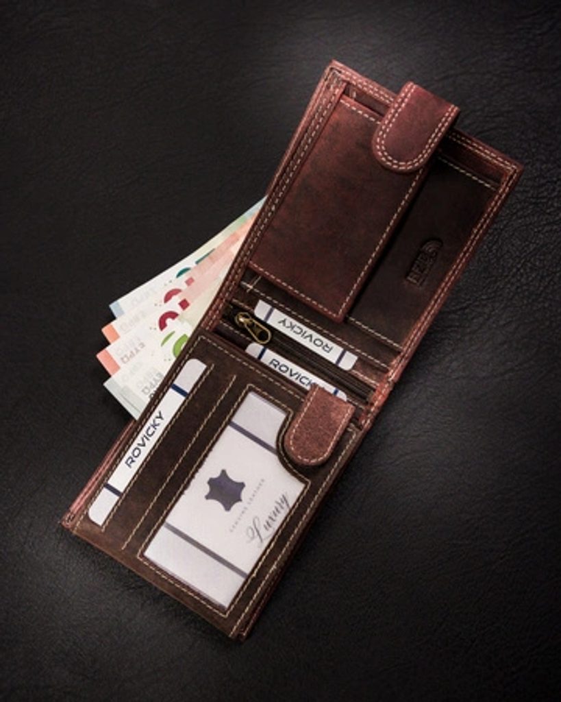 Denarnica elegantne oblike, izdelana iz kakovostnega usnja. Model denarnice je usmerjen po širini. Ta model ima praktično zaponko. Notranjost ima več predalčkov, kar bodo cenili vsi, ki radi hranijo kreditne kartice, kartice in druge stvari skupaj. Zaščita RFID je samoumevna.
