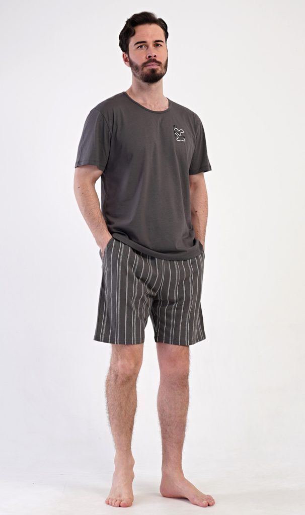 Udobna moška pižama je sestavljena iz majice s kratkimi rokavi in ohlapnih kratkih hlač.