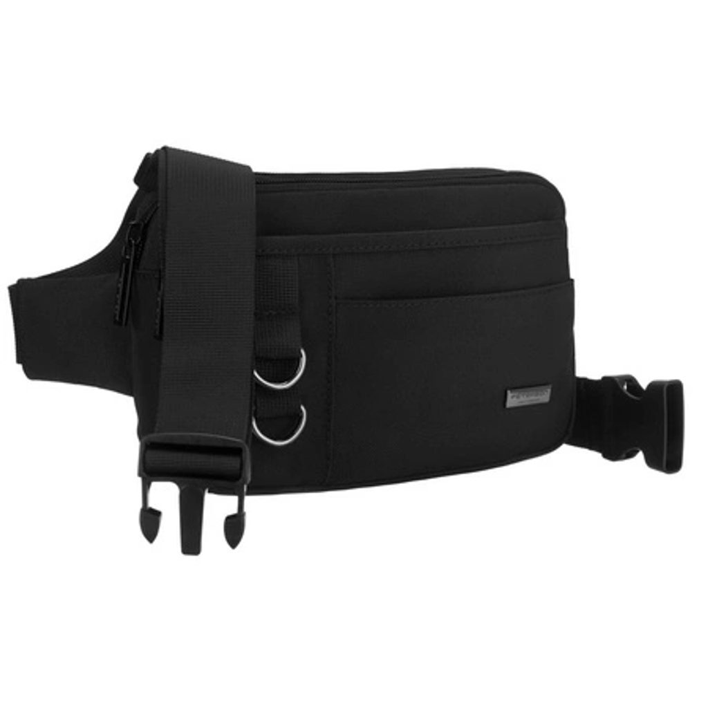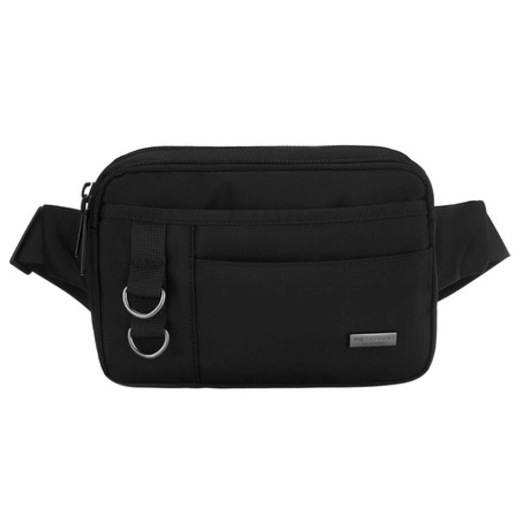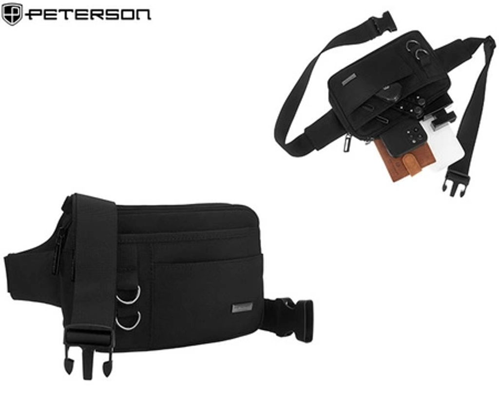 Moderna črna moška ledvična torbica je idealna za vsakodnevno nošenje. Model ima glavni predal z zapiranjem na zadrgo. Dodatni predali spredaj se prav tako zapirajo z zadrgo. Ta model je idealen za nošenje okoli pasu. Pas je nastavljiv po potrebi.