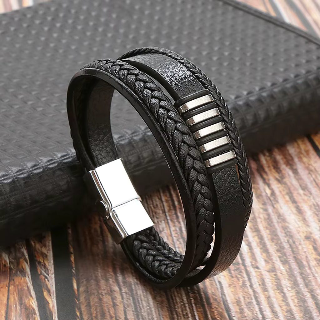 Moška zapestnica v elegantni črni barvi je odlična izbira za vsakodnevno nošenje, saj vaši obleki doda pridih elegance. Sestavljajo jo štirje usnjeni trakovi z različnimi teksturami, ki ustvarjajo bogat in zanimiv videz. Prevladujoči element so srebrni kovinski valjčki, nameščeni na sredini zapestnice, ki so obdani z gumijastim detajlom. Ti dajejo zapestnici sodoben in robusten pridih. Magnetna zaponka iz kakovostnega kirurškega jekla zagotavlja varno in udobno nošenje. Zaradi kombinacije usnja in jekla je ta zapestnica elegantna, vzdržljiva in vsestranska.