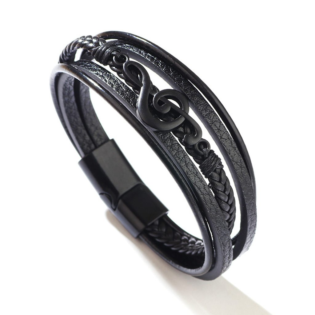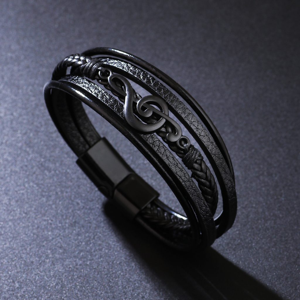 Elegantna moška usnjena zapestnica v črni barvi navdušuje z izvirno večplastno zasnovo in dominantnim detajlom v obliki violinskega ključa. Kombinacija gladkih in pletenih trakov ustvarja sodoben, a eleganten videz, ki bo odlično dopolnil tako vsakodnevne kot tudi priložnostne obleke. Zapestnica je zaključena s črno kovinsko zaponko, ki ji daje moč in izrazit moški značaj. Ta moška zapestnica z glasbenim motivom je odlična izbira za moške, ki ljubijo glasbo in želijo svojemu slogu dodati izviren detajl.