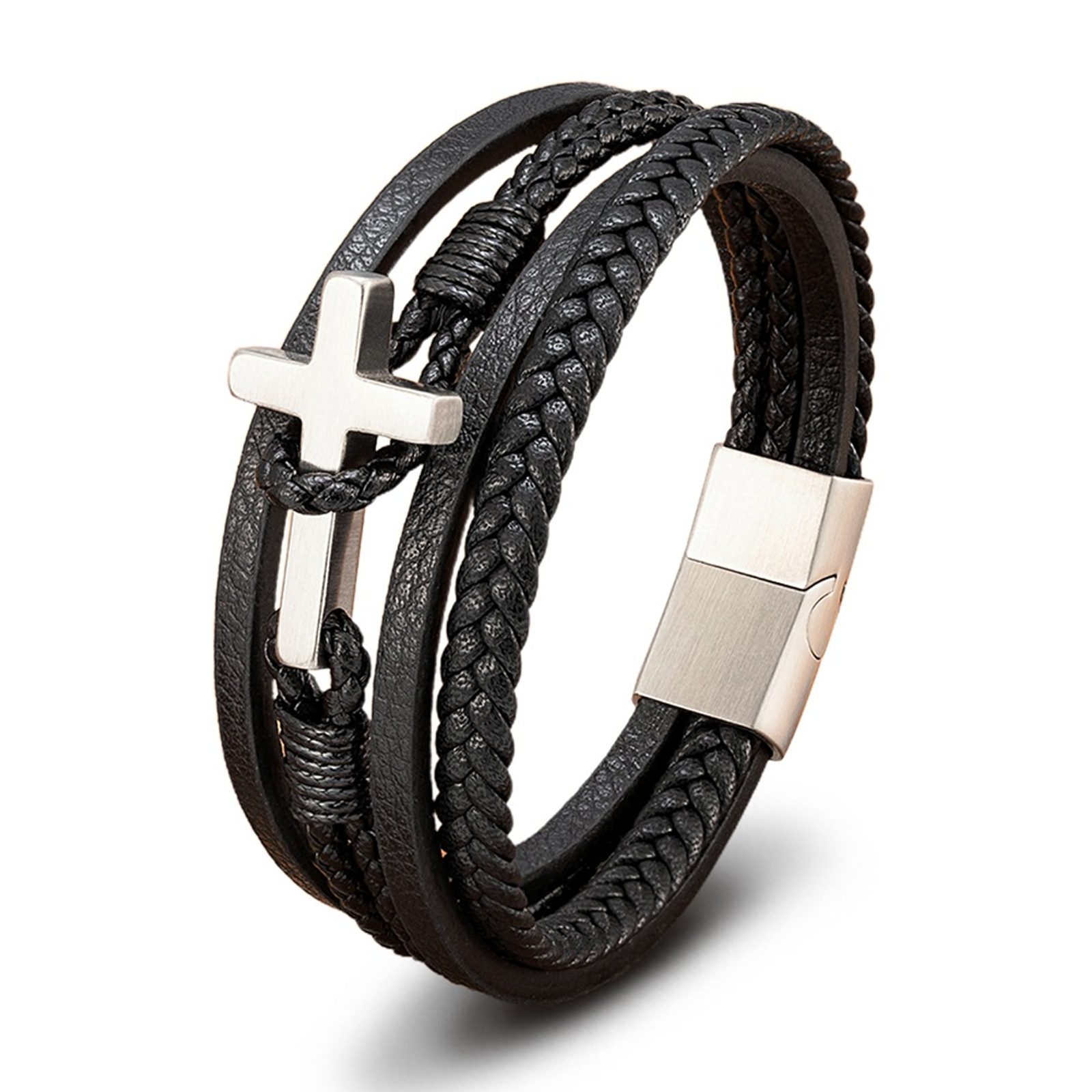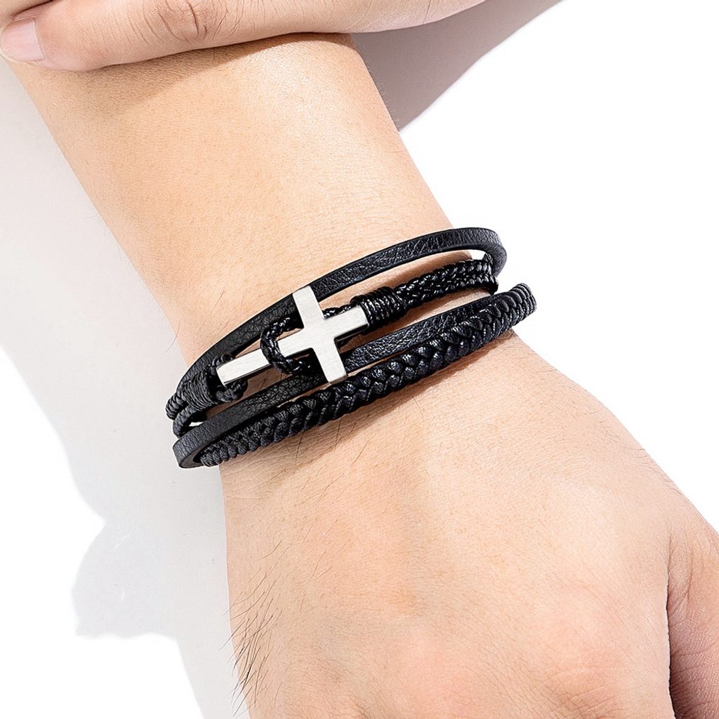 Elegantna in sodobna zapestnica je sestavljena iz več črnih usnjenih trakov z različnimi teksturami, ki ustvarjajo bogat in zanimiv videz. Njena glavna značilnost je srebrni križ, ki zapestnici daje močan in oseben pomen. Zaponka je sestavljena iz magnetne zaponke iz visokokakovostnega kirurškega jekla, ki zagotavlja udobno in hitro zapenjanje.